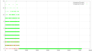 Finally I got myself a new laptop that is the fastest thing I've ever used; this significant change in the hardware forced me to run the same test one more time, in case of results being importantly different. So, here are the graphs for the same two things (WIPS and TT.H). The parameters are the same as in the last post, though there is a slight difference: number of emulated browsers is 20 (red) and 40 (green).
