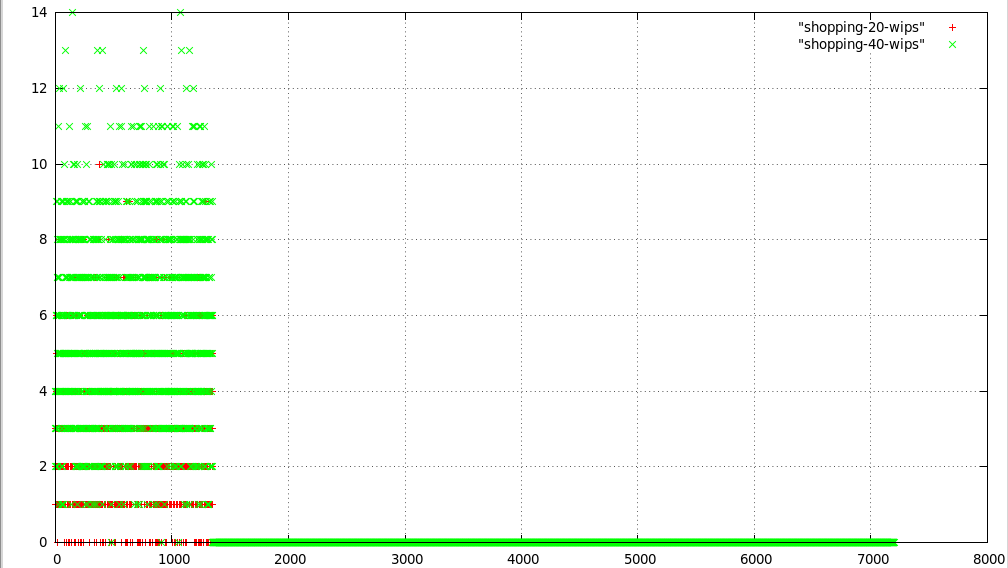 Finally I got myself a new laptop that is the fastest thing I've ever used; this significant change in the hardware forced me to run the same test one more time, in case of results being importantly different. So, here are the graphs for the same two things (WIPS and TT.H). The parameters are the same as in the last post, though there is a slight difference: number of emulated browsers is 20 (red) and 40 (green).